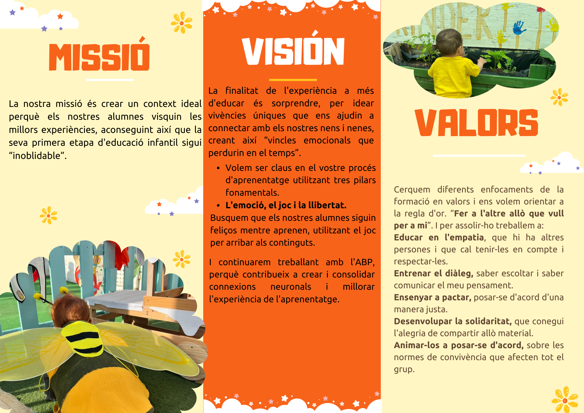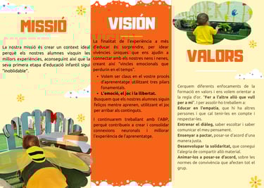 Som un centre infantil concertat, que prioritza les experiències físiques i socials sobre l'ús de les pantalles digitals al primer cicle d'educació infantil. Creem situacions d'aprenentatge adequades a l'edat i el ritme de cadascun dels nostres alumnes a través d'experiències pràctiques i significatives que els permetin el contacte directe amb la natura. El nostre projecte educatiu utilitza com a metodologia l'aprenentatge cooperatiu, l'ABP i l'educació holística. Ja que ens han donat molt bons resultats i bona acollida per part dels nostres nens i nenes, igual que una excel·lent participació per part de les nostres famílies.